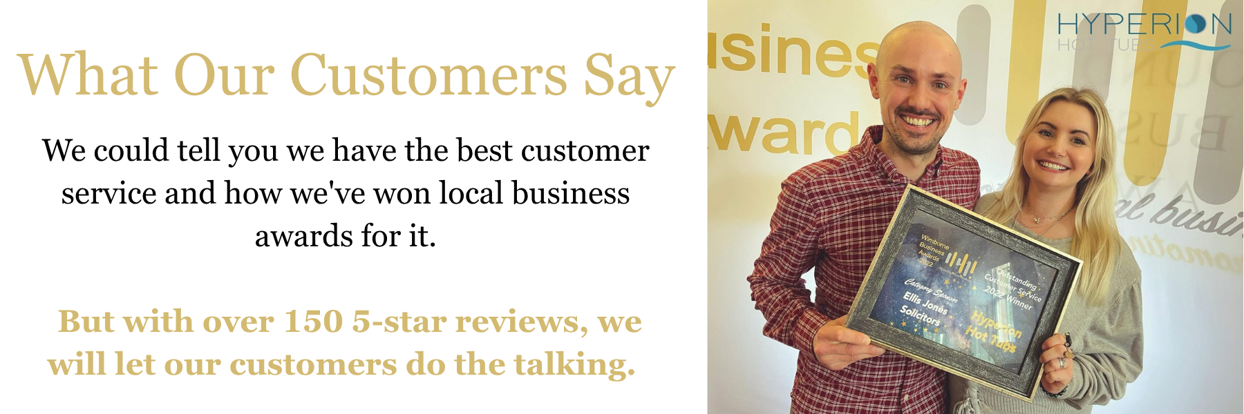 100% satisfaction from us with Hyperion Hot Tubs. Gave great advice in the sales room, lots of communication afterwards helping us choose the right hot tub.