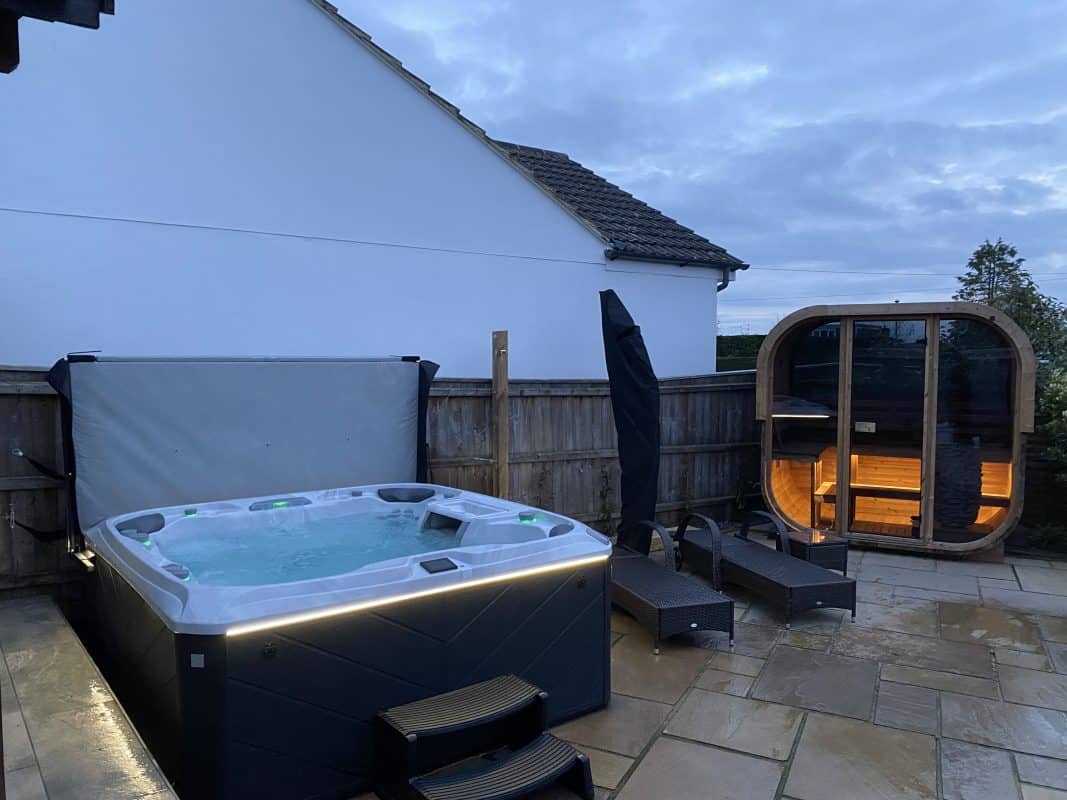 Colehill, Wimborne: A Hekla Cube 160 outdoor sauna paired with one of our flagship hot tubs.